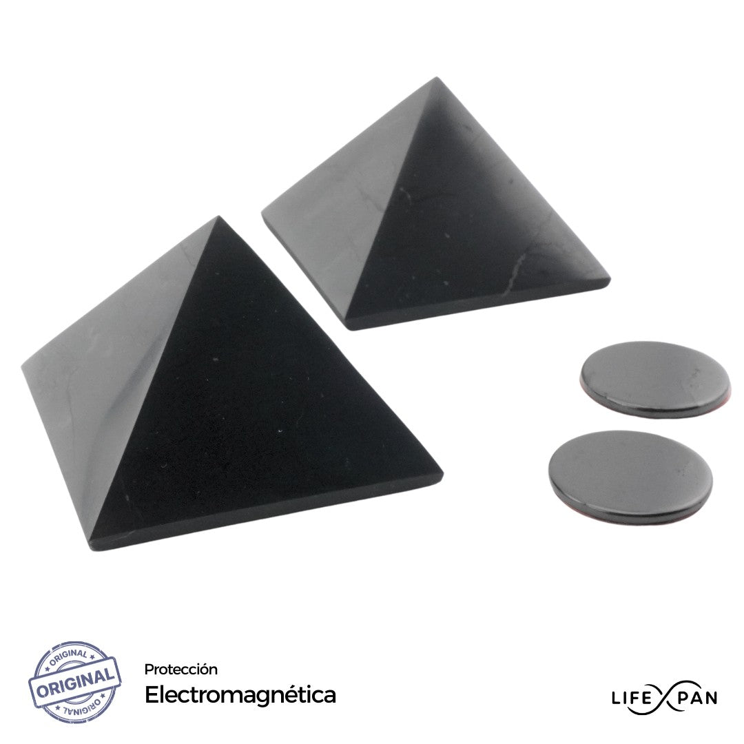 Pack x2 Shungita Pirámide 60mm Pulida + x2 Protección Movil 28mm – Nuevo Diseño by Rudy Bianco – 100 % Natural de Karelia (Rusia) | Protección Electromagnética + Activada | Geometría de Pirámide para Bienestar y Energía - LifeXpan® Quantum Shield
